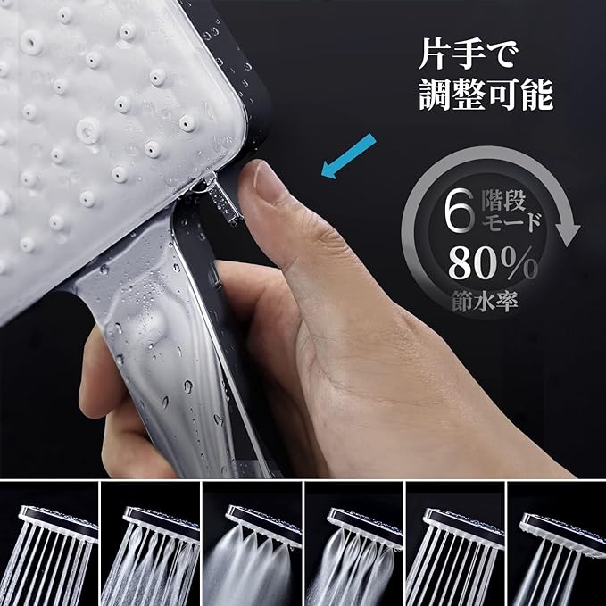 ・美容&節水効果と6階増圧段吐水で注目を集めている「シャワーヘッド」:SPA+レイン+マッサージの吐水方が組み合わせて6種類のシャワーモード。SPAモード:細かい霧状で毛穴の汚れに吸着し、肌の汚れをしっかり落とす、頭皮や肌環境が改善され、美容?肌ケアによい毛穴の奥までマイクロバブルが浸透するため、時間がたっても肌の水分量が維持され、保湿?保温効果が高い。マッサージモード:“ヘッドスパ機能”付きで適度な強さの水流によってケアできる腰や肩などの好みの場所に当てて、お湯であたたまりながら心地よく刺激することもできる。レインモード:大面積シャワー、全身の肌を包み込むやさしい水流、洗浄力が高く肌の汚れをしっかり落としてくれる。