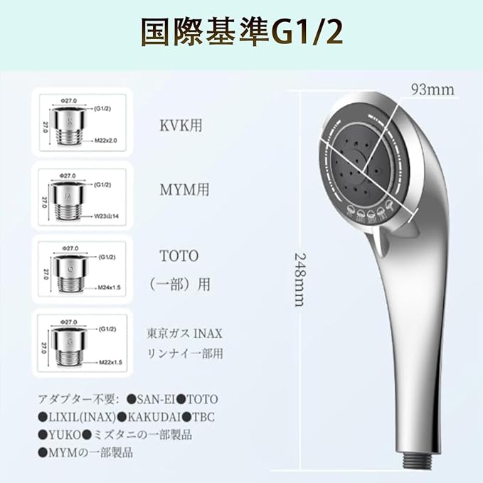 ・【5段階SPA調整】レインモード、ミストモード、レイン+マッサージモード、レイン+ミストモード、マッサージモードなど五つ切り替えモードがある最新デザインシャワーヘッドです。ミスト美肌モード:霧のように細かく、顔を洗っても刺激なく、女性にお勧めします。レイン+ミスト:ブレンドモードで強さと優しさの組み合わせ寝る前のシャワーに最適の選択です。レインモード:優しく流れて、一日の疲れを解消。