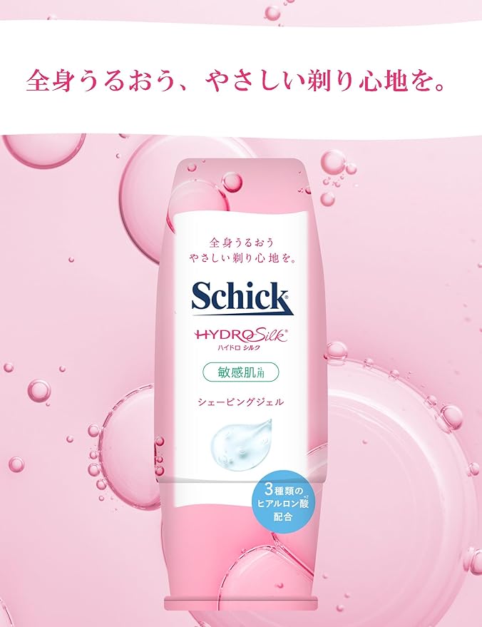 全身うるおうやさしい剃り心地を。敏感肌用*¹シェービングジェル。 3種類のヒアルロン酸*²配合ジェルが、肌を守ってうるおいシェービング。 *1 皮膚刺激性テスト済み。全ての人に刺激が起きないというわけではありません。 *2 加水分解ヒアルロン酸、ヒアルロン酸ヒドロキシプロピルトリモニウム、加水分解ヒアルロン酸アルキル(C12-13)グリセリル(いずれも保湿成分) Design, Specification, Appearance and price can change without notice 商品のデザイン、仕様、外観、価格は予告なく変更する場合がありますのでご了承ください。適量を手にとり、お手入れする部分によくのばし、ご愛用のシックハイドロシルクでシェービング。シェービング後は、水で洗い流して下さい。